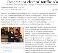 Desde una añorada bebida a camisetas de fútbol, productos cosméticos, derivados de la coca o una copia en lana de alpaca de la famosa chompa (jersey) a rayas del presidente de Bolivia, Evo Morales. Internet es una gran tienda en la que se puede conseguir prácticamente cualquier mercadería. Una de las causas de desarraigo entre los inmigrantes, la añoranza de los productos de su tierra, tiene fácil (aunque a veces no barata) solución incluso entre aquellos que viven lejos de las grandes ciudades.